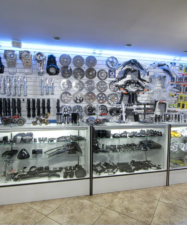 We have a large selection of chrome and powder coat in stock now. This is where you can personalize your bike without the down time.
